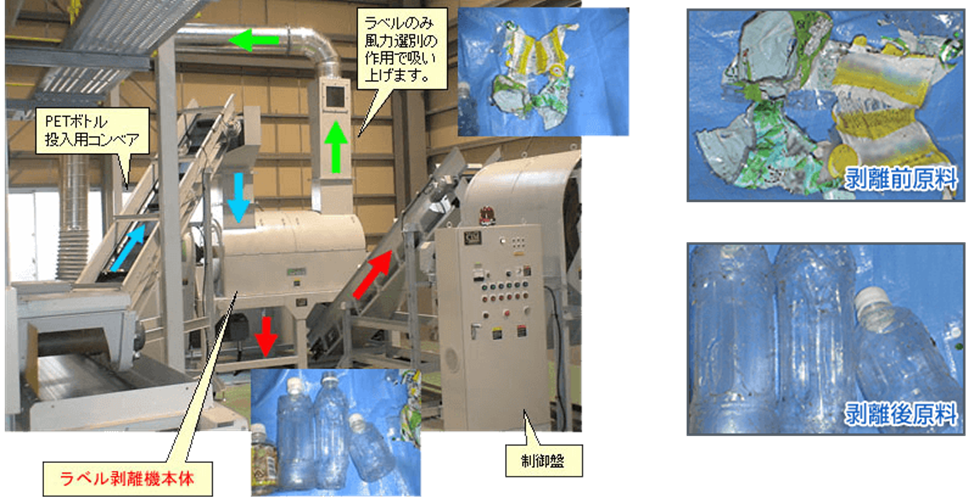 当時、日本にはペットボトルのラベルを連続的に剥がす装置がなく、粉砕後に比重選別する方式が一般的でしたが、それでは精度に限界があり、再生材の中にラベル片が混入してしまう問題がありました。